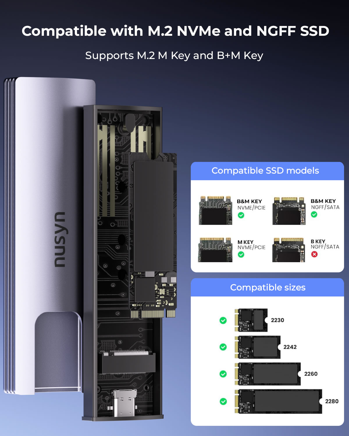 Dual NVMe & SATA Support: Compatible with both NVMe and SATA M.2 SSDs in sizes 2230 / 2242 / 2260 / 2280, giving you maximum flexibility for upgrades and reuse.