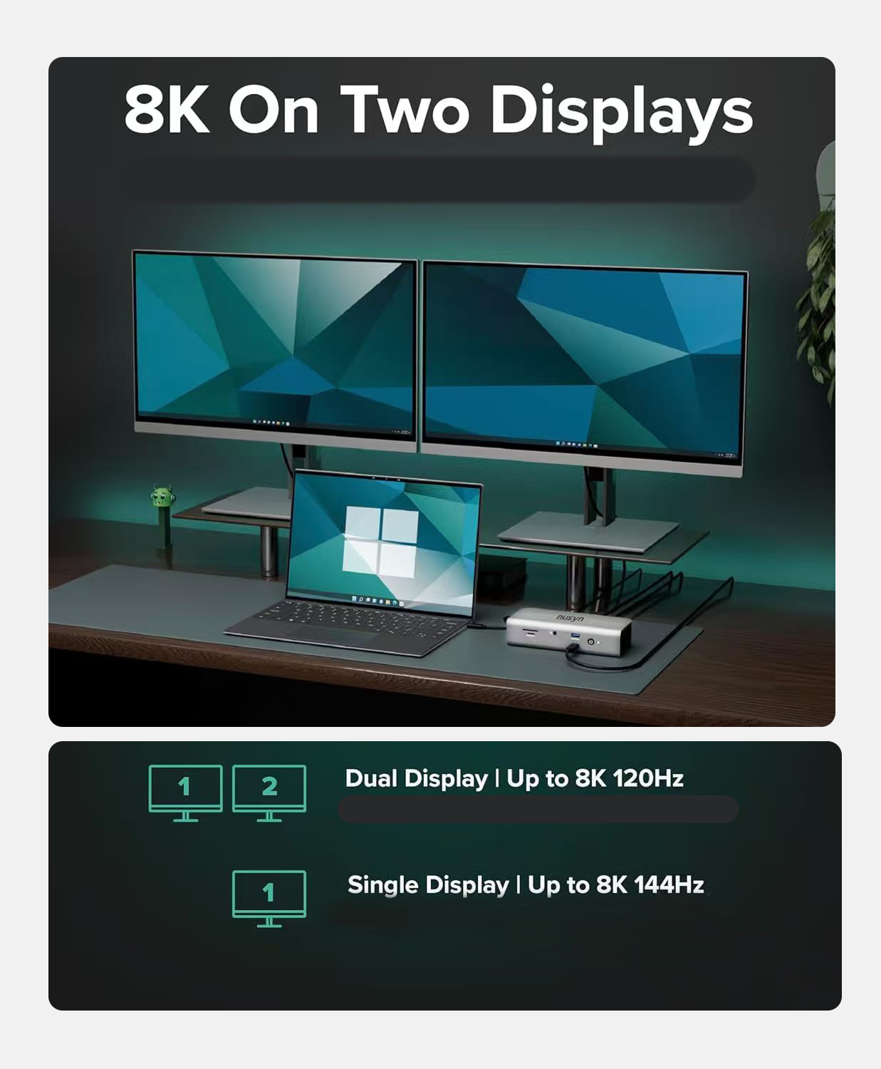 Supports up to 2×8K@120Hz or 2×4K@144Hz displays.