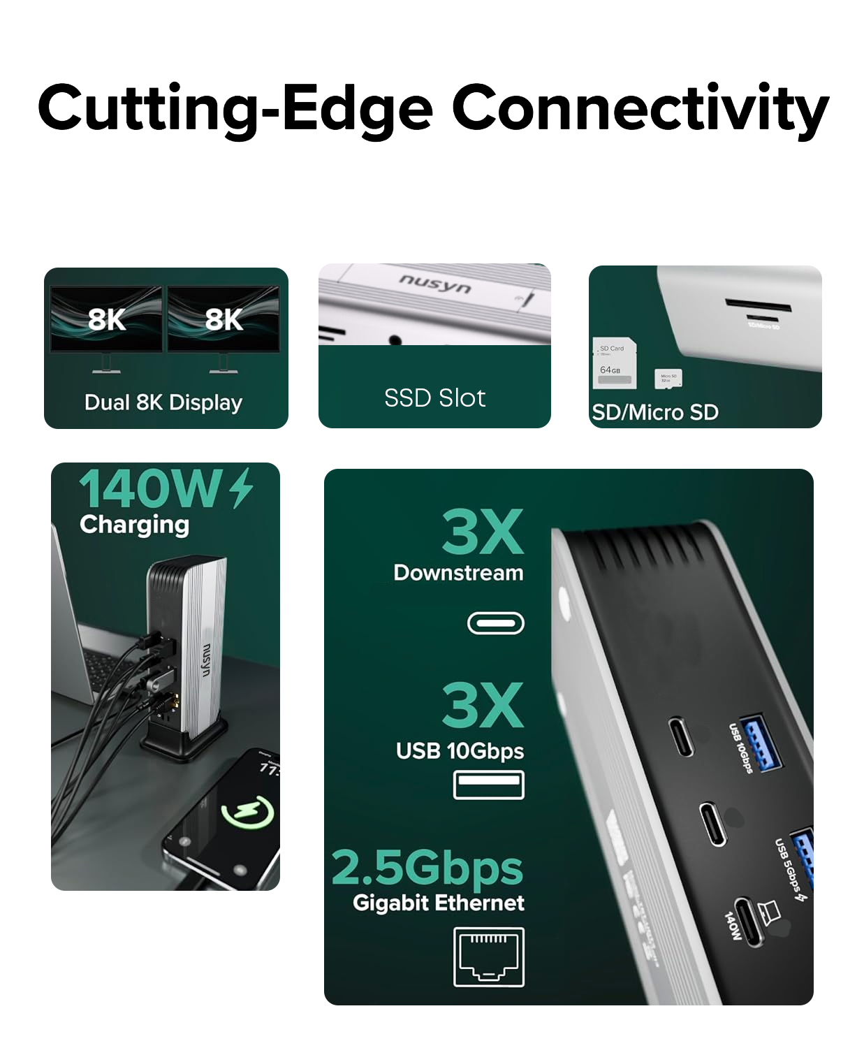 Docking station with built-in M.2 SSD slot, up to 140W power delivery, supports dual 6K@60Hz displays on Mac and dual 8K displays on Windows, up to 80/120Gbps bandwidth, 3× high-speed USB-C expansion ports, 2.5GbE networking, and driverless plug-and-play connectivity for Mac and PC.