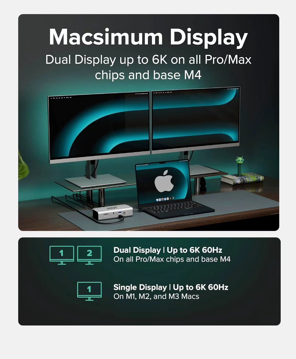 Supports up to 2×6K@60Hz displays on Macs with M4/M5 chips or earlier Pro/Max chip models.